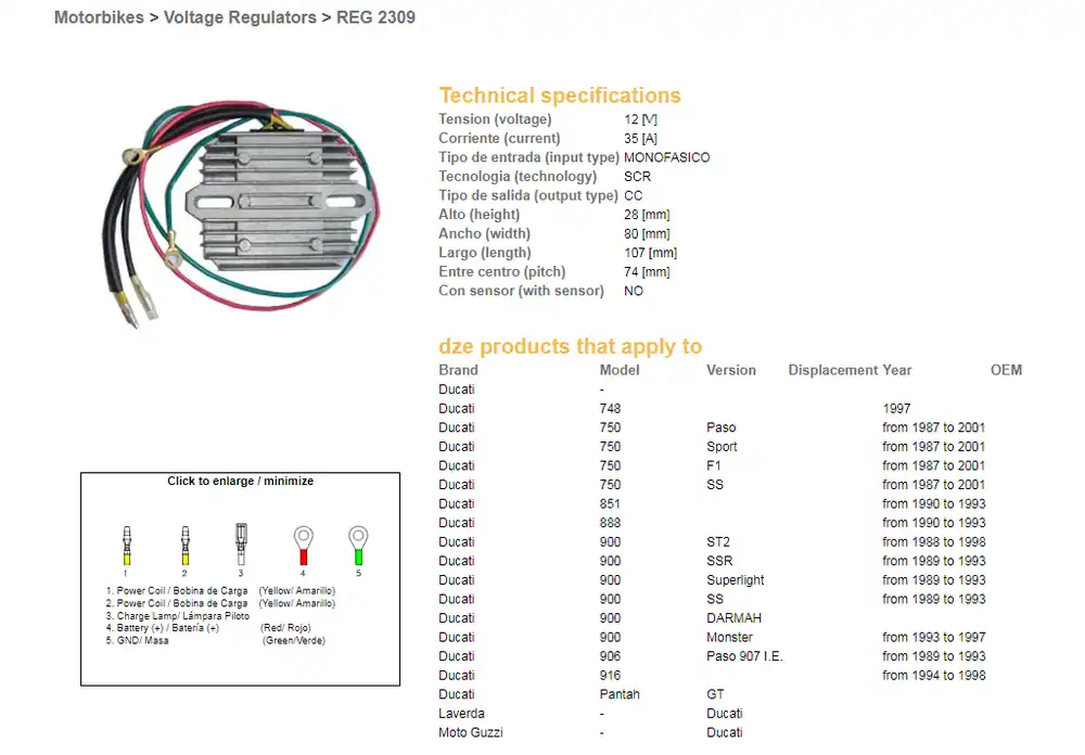 Kompletní specifikace KompatibilitaDíl DZE regulátor napětí DUCATI 748/750/851/888/900/906/916 87-01 (jednofázový, 35A) (ESR510;ESR515) je vhodný pro: