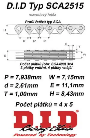 D.I.D Rozvodový řetěz DID KAWASAKI GPZ 900 R Ninja rok 90-96Řetěz japonské výroby. Dodáváme v rozpojeném provedení včetně spojky. Typ řetězu DID SC2515.Technické informace řetězu.